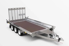 Solidna spawana przyczepa do przewozu maszyn budowlanych oraz bardzo ciężkich materiałów. Oryginalna konstrukcja daje możliwość chodzenia po całej długości burt wyposażonych w taśmy antypoślizgowe. Rama nośna spawana wykonana ze stalowych profili zamkniętych. Podłoga wykonana ze sklejki wodoodpornej antypoślizgowej zaopatrzona w solildne uchwyty podłogowe do mocowania ładunku zapewniające bezpieczeństwo przewożonych towarów. Bardzo wytrzymały dyszel typu V i podpory stabilizujące najazd. Podpora łyżki oraz koło podporowe z automatem składania w standardzie. Sprężyny ułatwiające opuszczanie i podnoszenie najazdu. Możliwość zastąpienia szerokiej rampy najazdowej dwoma najazdami redukując tym samym masę przyczepy, a co za tym idzie zwiększając jej ładowność.