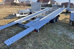 Przyczepa do przewozu samochodów z funkcją uchyłu powierzchni transportowej. Niski kąt najazdu (6 st.) daje możliwość łatwego załadunku pojazdów posiadających niskie zawieszenie. Najazdy chowane pod powierzchnią transportową. Stalowe blokatory kół. Dostępna wersja z pełną podłogą sklejkową lub podłogą z blachy na sklejce. Możliwość zamontowania burt aluminiowych jak i stelaża z plandeką.