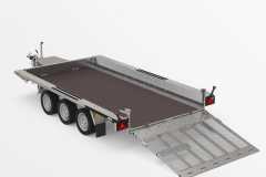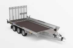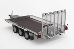 Solidna spawana przyczepa do przewozu maszyn budowlanych oraz bardzo ciężkich materiałów. Oryginalna konstrukcja daje możliwość chodzenia po całej długości burt wyposażonych w taśmy antypoślizgowe. Rama nośna spawana wykonana ze stalowych profili zamkniętych. Podłoga wykonana ze sklejki wodoodpornej antypoślizgowej zaopatrzona w solildne uchwyty podłogowe do mocowania ładunku zapewniające bezpieczeństwo przewożonych towarów. Bardzo wytrzymały dyszel typu V i podpory stabilizujące najazd. Podpora łyżki oraz koło podporowe z automatem składania w standardzie. Sprężyny ułatwiające opuszczanie i podnoszenie najazdu. Możliwość zastąpienia szerokiej rampy najazdowej dwoma najazdami redukując tym samym masę przyczepy, a co za tym idzie zwiększając jej ładowność.